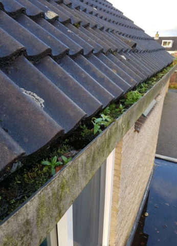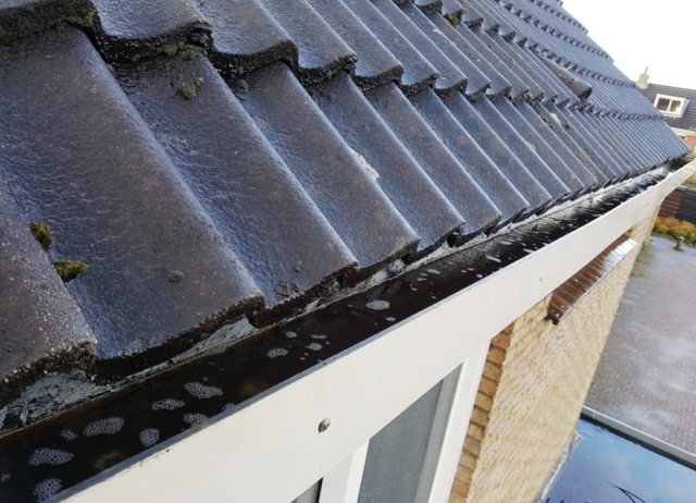 Dakgoot en gevelplaat (trespa) gereinigd.