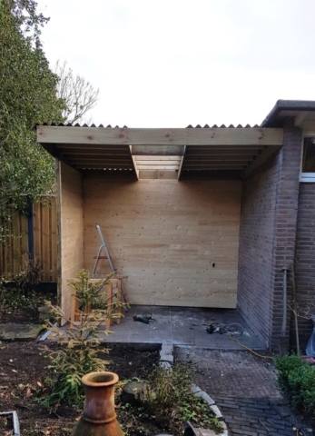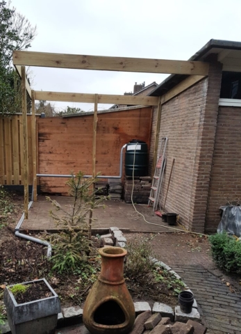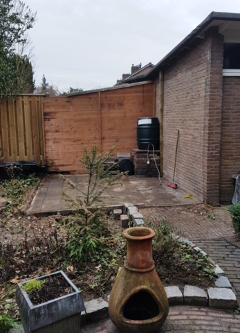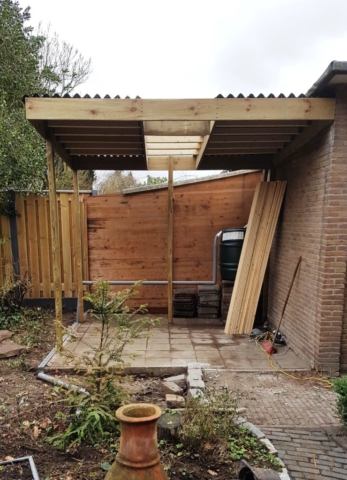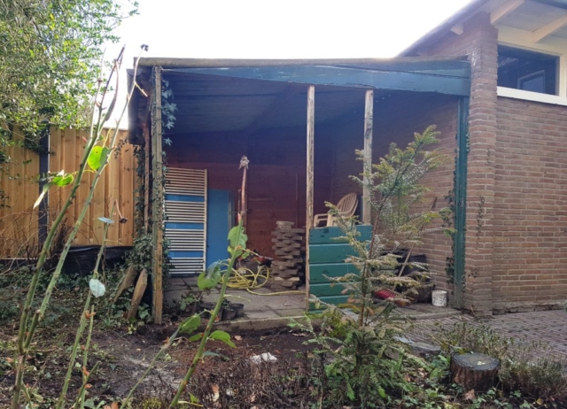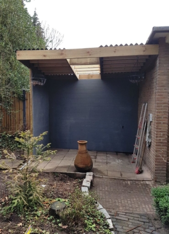 Oude schuur verwijderd en vervangen voor een overdekt zitje.